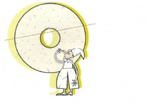 Temos uma mó, uma pedra de moinho. Se fizermos um corte rectilíneo como o indicado, a pedra fica dividida em duas partes.